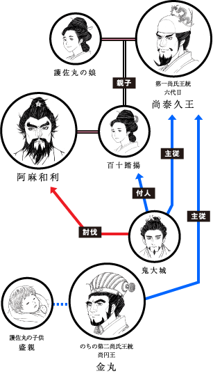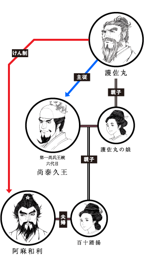 また、護佐丸を討った阿麻和利はその後、さらに尚泰久王をも攻略しようと企てます。ですが、阿麻和利の妃であり、尚泰久王の娘、さらには護佐丸の孫にもあたる百度踏揚とその家臣の大城賢勇(うふぐしくけんゆう)に見破られ、勝連城とともに滅亡してしまいます。