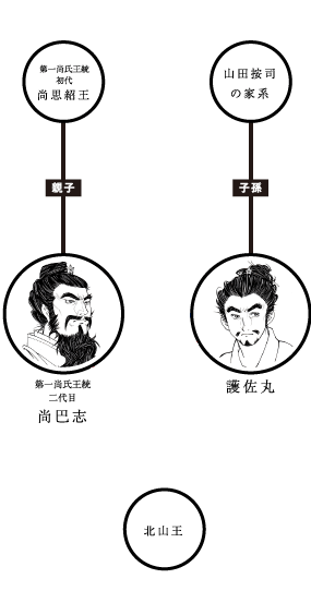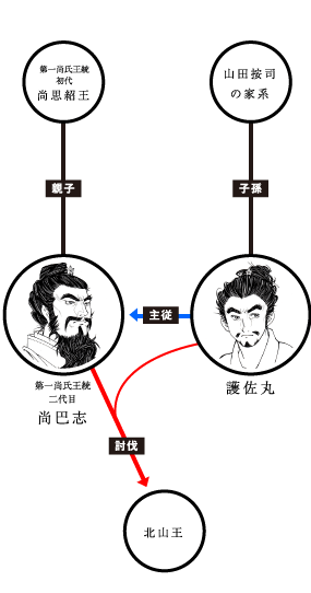 1390年頃、山田グスク按司の三男として生まれました。幼いころの名前は眞牛(まうし)と呼ばれていたようです。彼の先祖は、元々は北山の今帰仁按司で、戦に敗れ山田グスク按司となりました。そして、彼が青年期の時に、運命の時が訪れます。一族の宿敵とも言える、先今帰仁グスク按司・攀安知(はんあんち)を討伐する機会を得ました。それは、琉球王国統一ための戦いでした。中山軍に参加し、当時仕えていた尚巴志と共に今帰仁グスクを攻め落とすことに成功したのです。