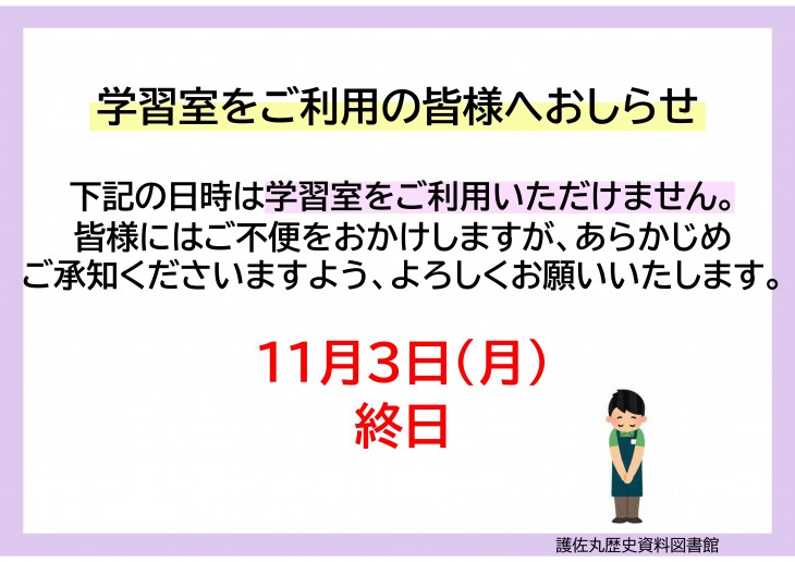 図書館イベントのため下記の期間、学習室をご利用いただけません。