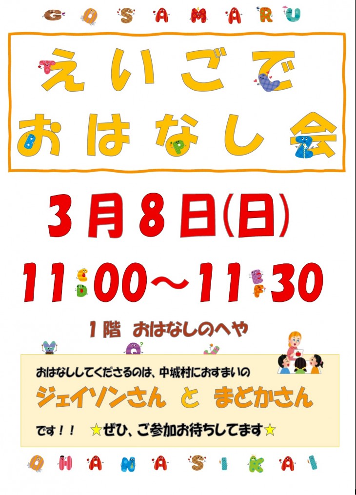 日時:令和8年3月8日(日)10:30〜 場所:護佐丸歴史資料図書館1階おはなしのへや