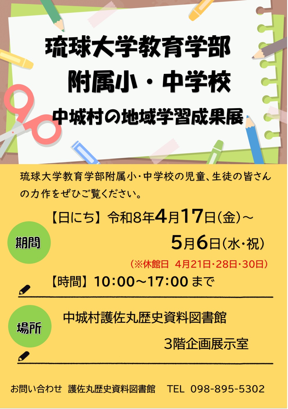 琉球大学教育学部附属小学校(3年生・4年生)・中学校(2年生)の児童・生徒の皆さんが授業で取り組んだ、中城村の地域学習成果展を行います。