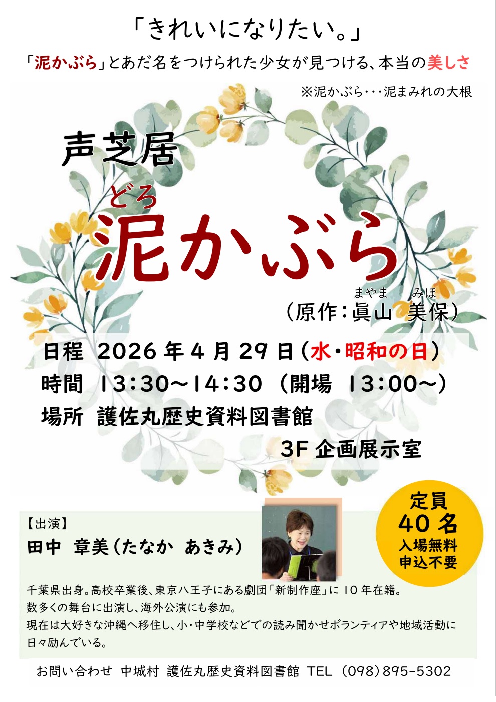 護佐丸歴史資料図書館にて、元新制作座劇団員の田中章美氏による声芝居「泥かぶら」を公演いたします。(※本公演は1月12日に実施を予定していましたが、臨時休館となったため振替公演を決定しました。)