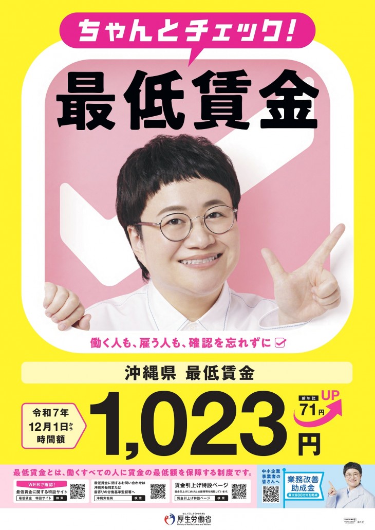 令和7年12月1日から沖縄県最低賃金は時間額1,023円です。働く人も、雇う人も、必ず確認しましょう。