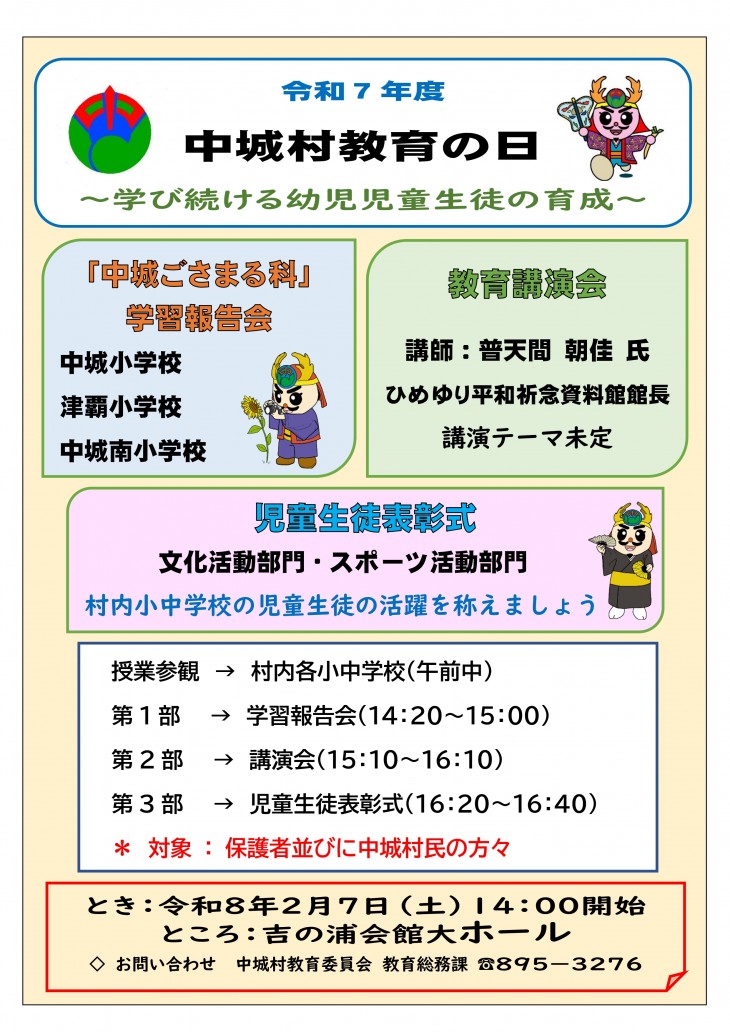 令和8年2月7日土曜日に第8回「中城村教育の日」を開催いたします。